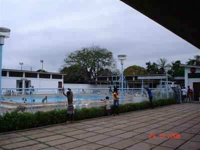Continuando com as fotografias que o Heleno tirou em Outubro de 2006, aqui podemos ver o cinema de Cambambe, só que a projecção no ecrã deu lugar a uma TV ligado através da Parabólica, como se pode observar pelo grupo (debaixo da bancada) que assiste a um jogo de futebol.